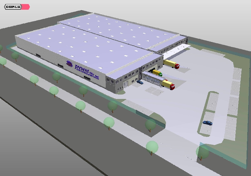 2 Hallen mit jeweils 113 m Länge und 50 m Breite, durch Brandwand getrennt. 2 eingebaute Büros mit 8 m x 50 m |